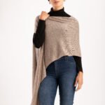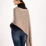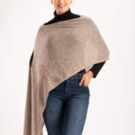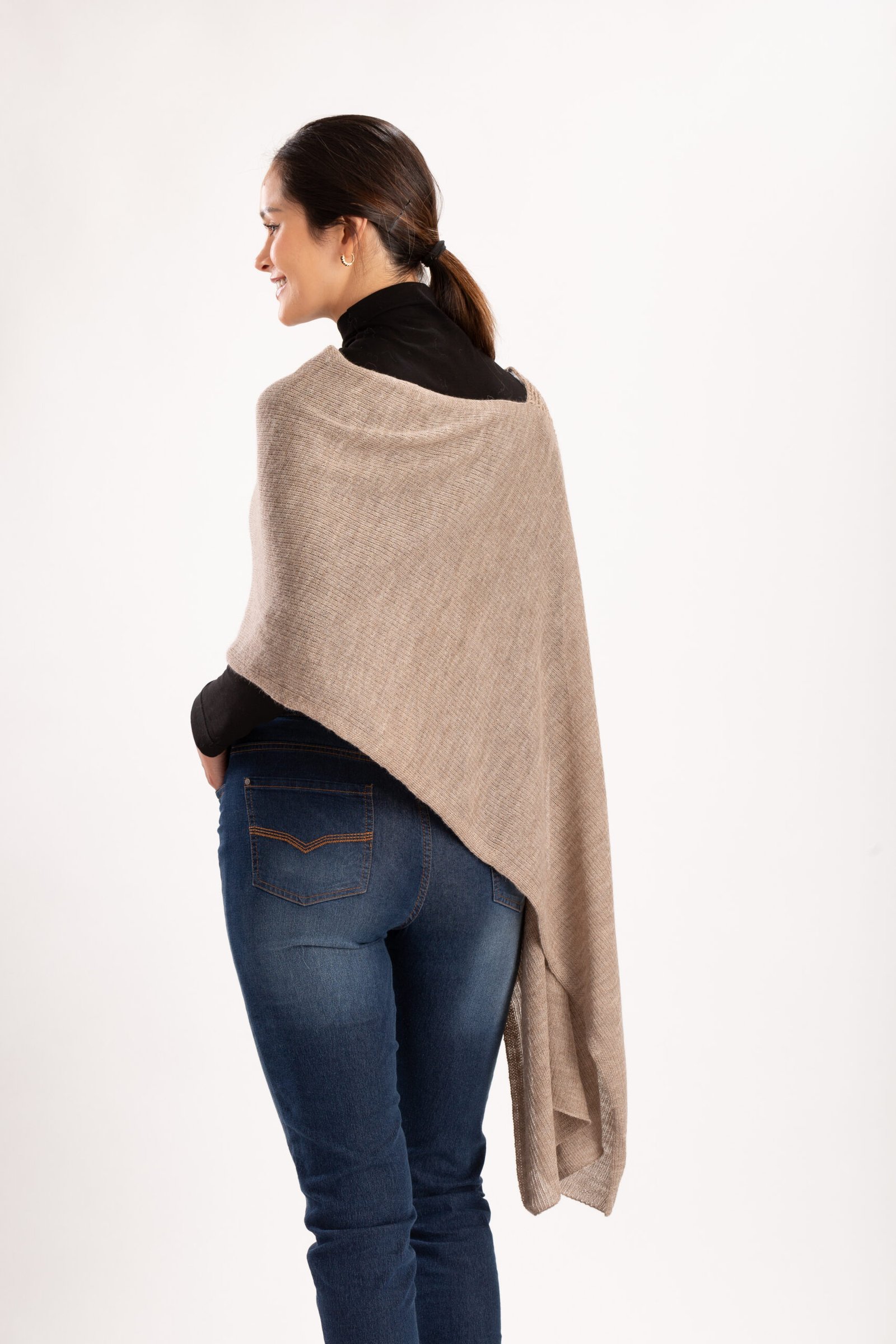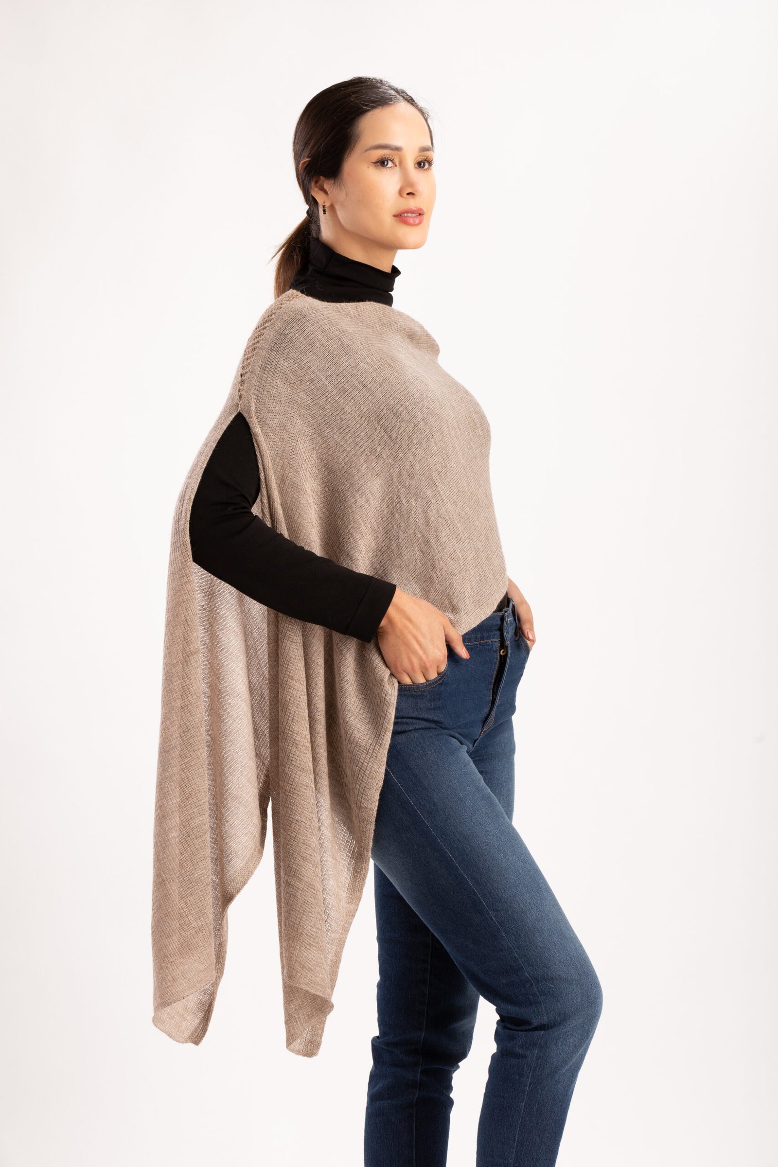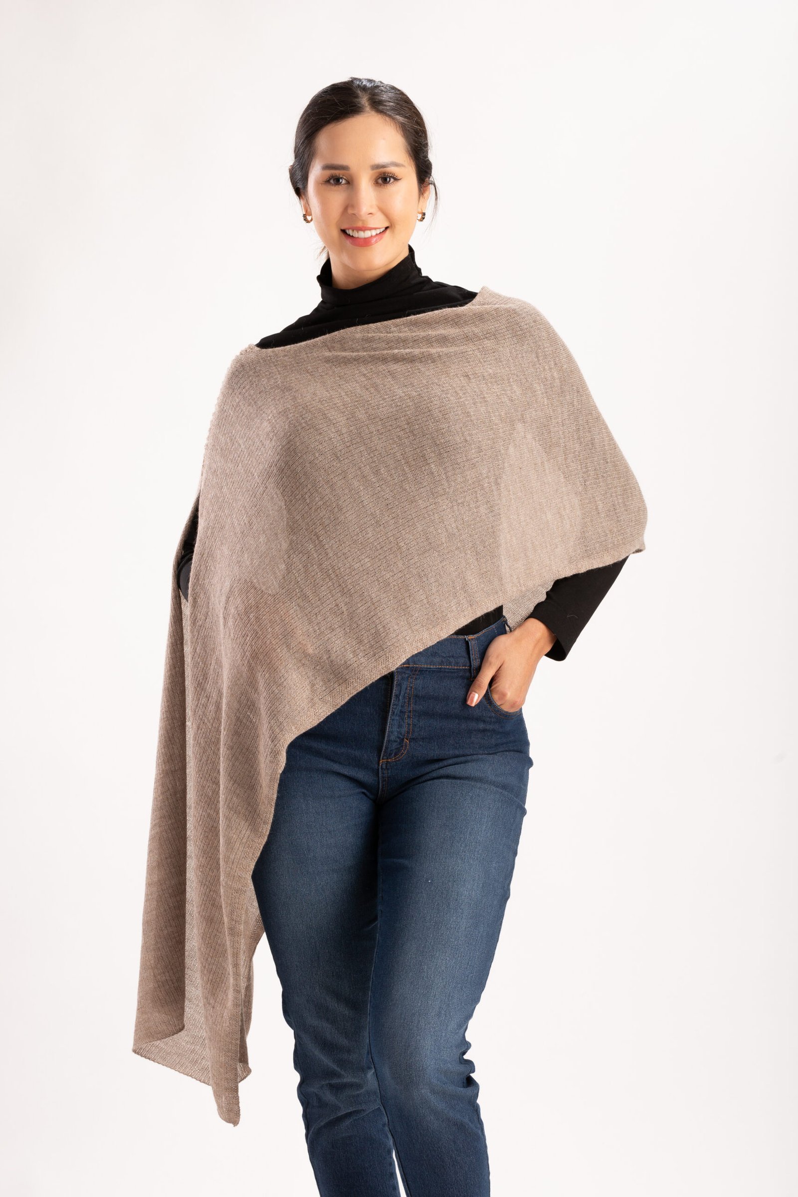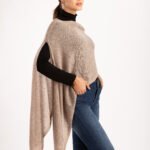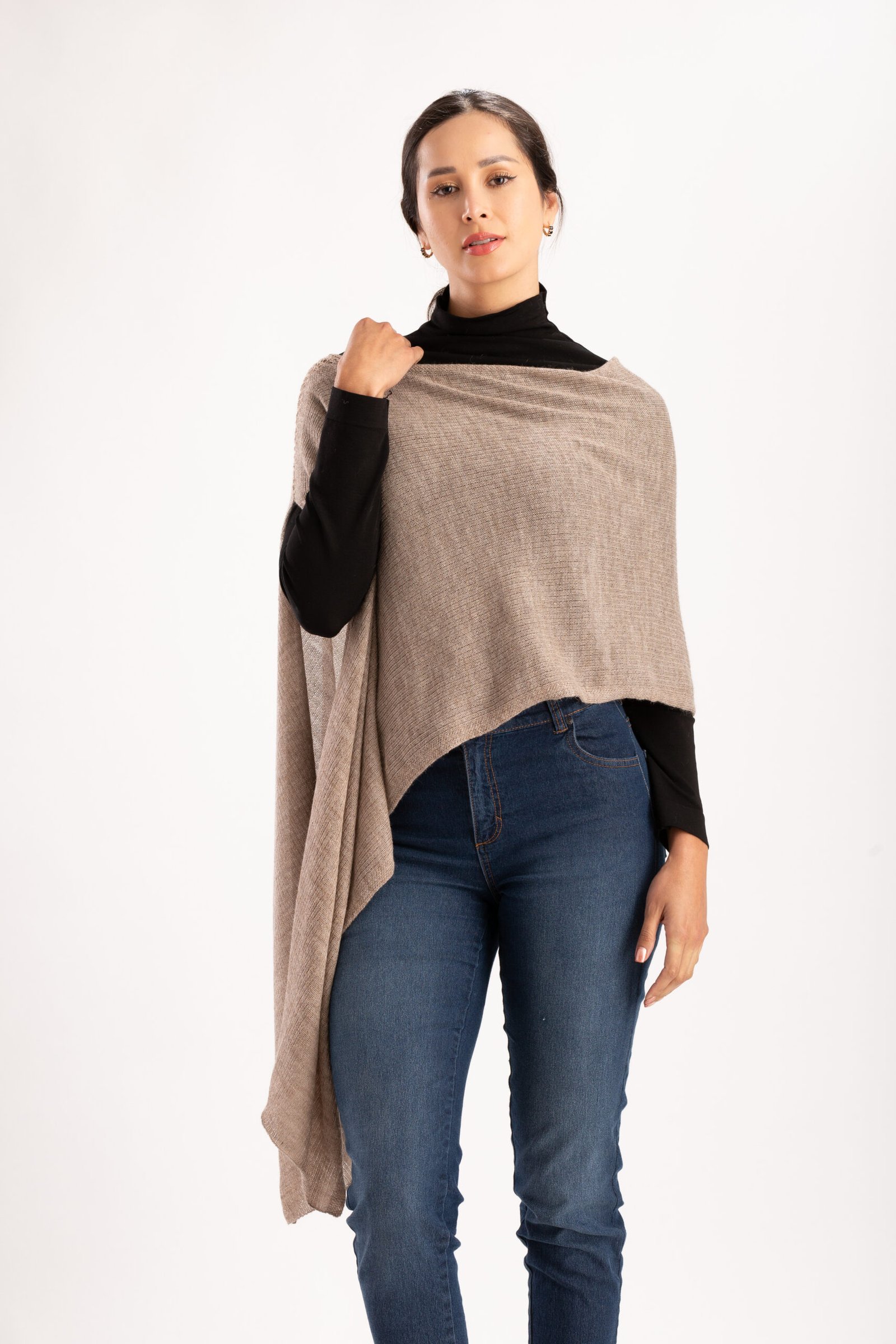 Asymmetrisches Cape aus 100 % Babyalpaka. Edles, neutrales Beige – wärmt ohne Gewicht und wirkt minimalistisch-elegant.