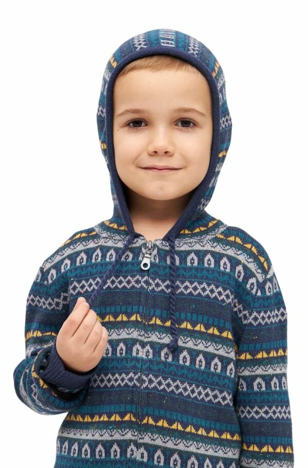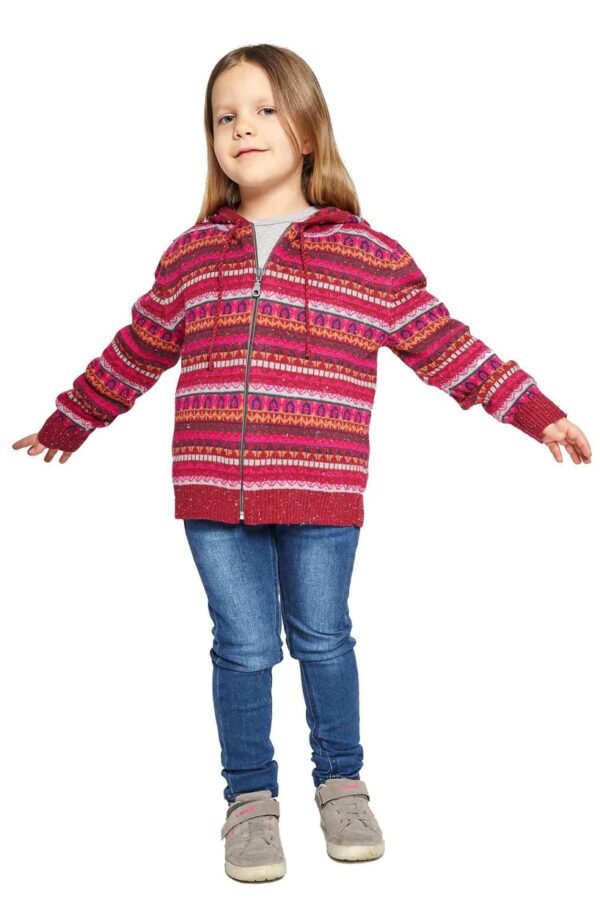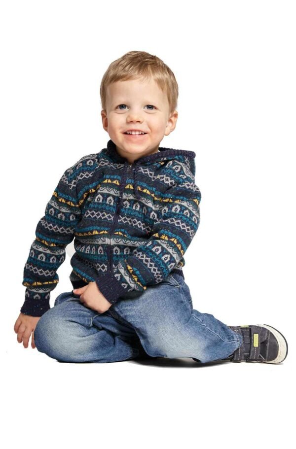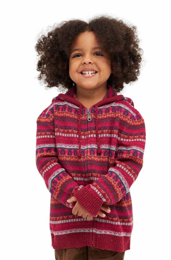 Diese farbenfrohe Kapuzenjacke in schönem Jaquard-Strick ist durch ihre Materialzusammensetzung mit Baby Alpaka sehr weich, gleichzeitig strapazierfähig und wunderbar pflegeleicht. Ihre Kinder können unbekümmert spielen, denn dieses Schmuckstück kann in der Maschine gewaschen werden.